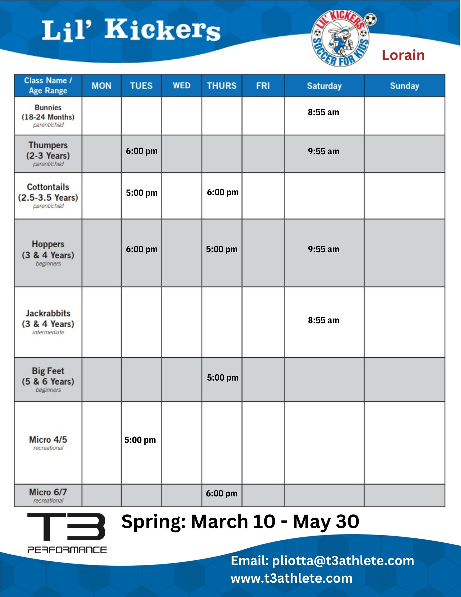 Cost: $18/week + an annual registration fee, which includes your Lil’ Kickers Jersey!